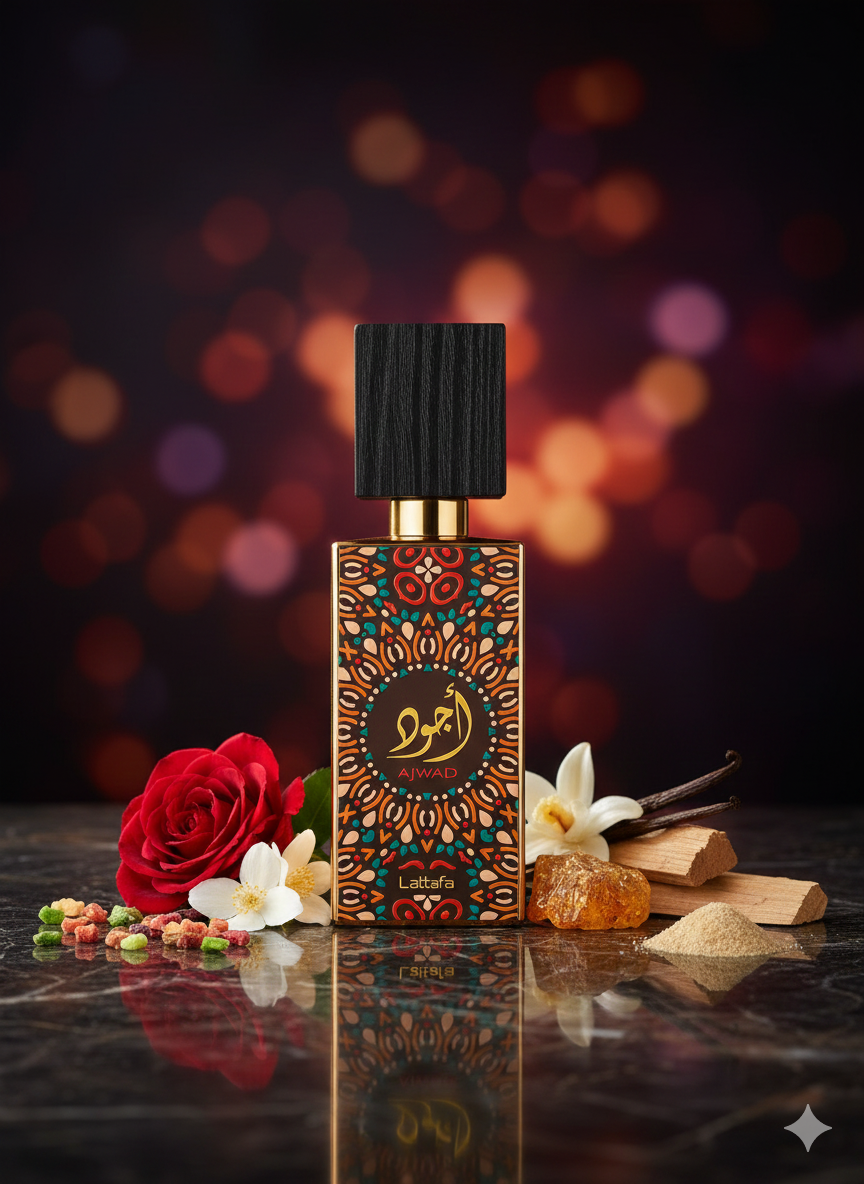 Ajwad combines fresh fruity notes with a rich floral heart and a warm, woody base, creating a versatile unisex fragrance. Ideal for daily wear and special occasions.