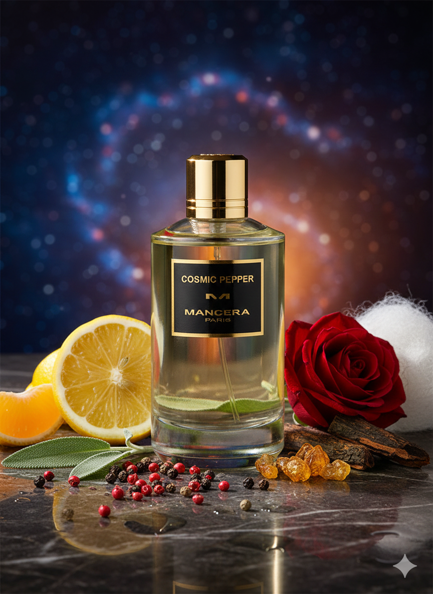 Cosmic Pepper is a vibrant and spicy fragrance that blends fresh citrus and aromatic notes with a warm, woody base. This captivating scent opens with a lively blend of lemon, pink pepper, sage, and tangerine, creating a fresh and invigorating introduction. The heart unfolds with a spicy and floral accord of black pepper, Damask rose, and oud, adding a touch of warmth and complexity. The base notes of white musk, tonka bean, ambergris, oakmoss, and labdanum provide a warm and sensual foundation, leaving a lingering impression of sophisticated depth.
