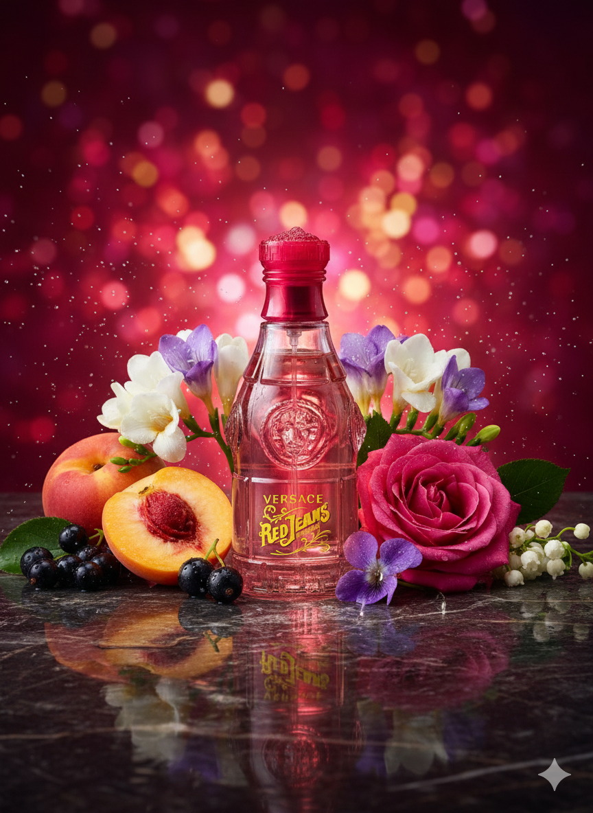 Versace Red Jeans is a youthful, joyful burst of florals and fruits that captures 90s energy in a bottle. It starts off with a fizzy, sweet burst of peach and apricot blended with freesia, instantly cheerful and flirty.